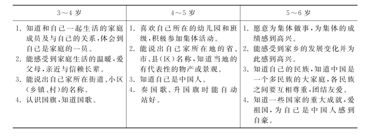 当今世界多元文化并存,指在世界不同民族、不同国家之间的文化交流中,各自在保持其文化个性前提下的共存状态。文化个性是文化多样性存在的前提,因而,学前儿童要适应多元文化,必须首先了解、认识自文化,并逐步建立文化自尊,这是多元文化适应教育的首要目标。也即要让学前儿童认识和了解本国本民族的文化,感知中华民族内各民族的生活方式、民族特色、民族礼仪、民族语言等,在此基础上领会中华民族的伟大与美好,从而树立初步的民族自豪感和自尊心。这个目标可以顺次分解为:①了解、热爱自己的家乡(从村镇或小区到县/地市到省);②认识自己的民族,了解中国其他民族;③认识自己的国家,初步形成中华民族自豪感。《3~6岁儿童学习与发展指南》中社会领域“社会适应”子领域的目标之一,“具有初步的归属感”有类似的表述,具体如下: