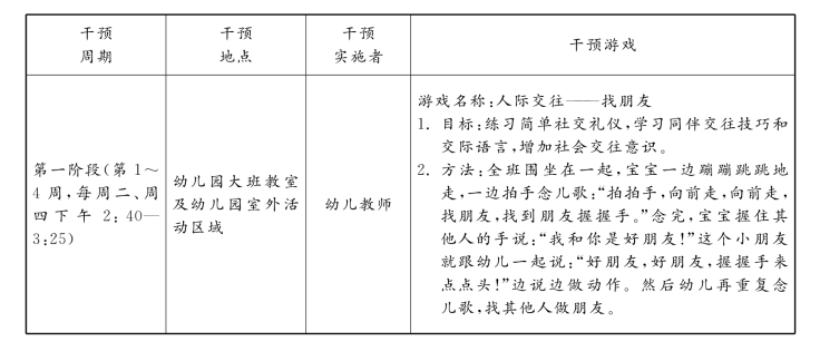 为丰富小寒的社会交往技能,教师在干预开始阶段选择了“做客”的游戏。让小寒能够学会基本的社交礼仪,体验同伴交往的乐趣。教师将区角的游戏区布置成“娃娃家”,区域内有各种家具、玩具等。在游戏开始之前,应该由教师示范正确的交际礼仪,让幼儿清楚地理解这些基本的交际知识。教师交代给小寒做客的礼仪,学会敲门、问候主人以及成为主人的家人,在游戏的过程中,不断加入其他的角色,比如主人的孩子、朋友等,让小寒学习对不同的人要使用不同的正确的称谓。在游戏中,教师还根据小寒的表现,常常提示她该怎样行动或者是怎样表达。在“娃娃家”,主人主动邀请小寒一起游戏,度过了愉快的游戏时间。做客结束时,小寒与小主人告别,还主动邀请小主人也去自己家做客。游戏结束后,教师要对小寒游戏中的行为表现作出及时的点评,鼓励强化小寒的正确的做法,并且给予了小寒小小的奖励。