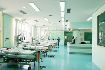 医院的门诊和病房楼(图2-2-11)等处人员集中,患者和陪护、探望人员数量众多,不少危重患者行动不便,加之医院内建筑结构复杂,各个部门科室相互连通,一些医院出于防盗和管理方便夜间锁闭安全出口、安装防盗铁栅栏,病房走道加设病床占用疏散通道的情况屡见不鲜,一旦发生火灾,造成疏散困难,同时,也增加了消防人员的施救难度。