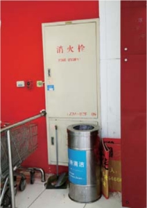 (2)标志醒目、无遮挡。查看消火栓箱标志应醒目、清晰,本体及周围不存在影响辨识的障碍物(图2-4-11),箱体上应张贴操作说明。