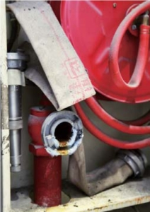 (3)组件齐全、完好。打开箱门,检查水带、水枪、消火栓、消火栓启泵按钮应齐全;水带无霉变、粘连,涂胶层无开裂;消防接口与水带连接应牢固,密封圈应完好;消火栓接口、手轮应完好(图2-4-12),用于减压、稳压的孔板等完好;消火栓启泵按钮接线应完好;击打锤应在位。
