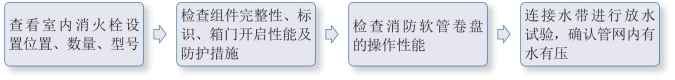 (3)软管卷盘、水带应完好。软管卷盘的操作应方便,连接处无渗漏;消防水带在有压力状态下应能正常供水,各接口处无渗漏。
