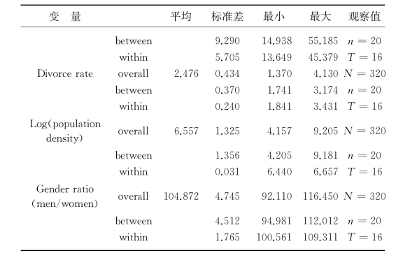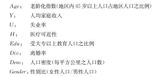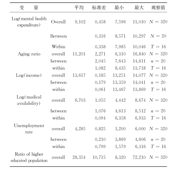 其中Doctors为该地区的医生人数,Hospitals为该区域每1 000人的医院或诊所数目。在教育水平部分,本文以15岁以上人口受大专以上高等教育的比例作为代表变量;失业率的定义则为目前处于失业状态,但正努力寻找工作的劳动力比例;老龄化指数则为该地区65岁以上人口占地区人口的比例。离婚率指粗离婚率,亦即一年间离婚对数对同一期间之期中人口数的比率;本文参考霍姆斯等人(Holmes and Rahe,1967),使用离婚率作为社会经济因素的代表指标之一。此外,一个地区都市化程度越高,人口密度也相对提高;为了了解都市化程度对精神健康的影响,本文实证模型中亦使用人口密度作为解释变量。又依据卫生研究院的个体层级的数据显示,年长女性比年长男性有较高的精神疾病罹病率,因此,本文实证模型亦加入性别比作为解释变量。