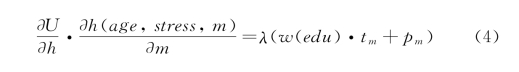 在公式(1)中,U(·)为效用函数,(2)式中的函数h(·)为健康状况;人们通过医疗投资(m)来维护精神健康,但在年龄和压力的影响下,失去他们的健康。公式(3)则表所得的限制条件;(3)式等号左方为所得总额,右方则为消费与医疗支出之总额。其中,w代表每单位劳动时间的工资收入,T是一个人总的可用时间,P是消费品的价格,Pm为医疗服务的价格,tm则是为了维持身心健康的医疗投资时间。为了看病,患者不仅需支付医疗治疗费用(pm×m),并且因为请假看病而产生工资损失的隐性机会成本((w·tm)×m)。教育水平的提高可以提高劳动生产力,因此本文工资所得是教育水平(edu)的增函数: