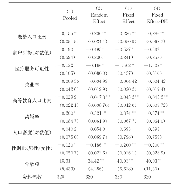 实证模型的检定结果为台湾地区的县市追踪资料集具有跨县市的横截面差异性,且数据有跨区域的相依关系。因此,本文的实证模型是以固定效果的回归模型估计,并参考Driscoll和Kraay对标准差作修正,以得出空间相依一致性的标准差估计量。表3第4列(fixed effect-DK)所显示者为对区域相依性作误差修正后的固定效果模型的估计量,其与一般固定效果模型估计量的差异在于每一变量的系数估计值下方括号内的标准差有所差异。