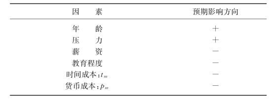 stress>0。一般而言,教育程度的提高会提高每个人的所得和健康知识。更高的教育会增加健康存量,并减少医疗m的需求;然而,医疗治疗成本的增加,包括接受医疗的时间成本(tm)和金钱成本(pm)均增加,将会降低对医疗服务(m)的需求。依据前述模型,表1整理出各因素对精神疾患医疗支出需求的预期影响方向: