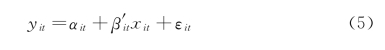 其中i表示横断面之身份指标(cross-sectional identity),i=1,2,…,n;t表示时间序列,t=1,2,…,T。yit是因变量,xit则是说明变量;αit是每个实体的未知的截距项,βit是代估计系数,εit是误差;假设Corr(xit,εit)=0,亦即自变量与干扰项之间无关联。传统追踪数据模型假设横断面及时间序列之数据具有同构型,亦即α1t=α2t=…=α,β1t=β2t=…=β。然而,模型(5)中横断面的个体或时间序列的数据可能存在异质性或未观察到的差异性。因此,模型(5)中如果不能确认异质性的存在与否,并在模型估计时对潜在的异质性做修正,其估计结果将产生偏误。这个问题在实证研究来说,是研究者必须对资料的估计结果做诊断,并在混合估计模型(pooled model)、随机效果模型(random effect model)或固定效果模型(fixed effect model)之间,依据诊断结果做出估计方法的选择。
