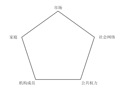 西方的福利多元主义的思想并不追求解构国家在福利产品供给中的角色,福利多元主义解构的毋宁说是将“福利”与“国家”同置于一个语义结构中的“国家中心主义”和“一元主义”的思维。福利多元主义所限强调的是社会语意上的“多”,也即“多元结构”取代了“一元结构”,“社会多中心主义”逐步取代了“国家中心主义”的观点,进而“福利混合”取代“福利国家”成为福利制度的中心内涵。在“福利多元”和“福利混合”的理论流派中,一个基本的分析框架为:社会中不同的角色如国家公法权力体制、市场、社区、家庭、邻里、社会慈善福利组织和社会非营利组织等分别提供不同的社会福利产品,众多福利组织者发挥着协同的作用来共同完成社会福利的目标。例如,研究社会福利学者德诺贝格(de Neubourg)提出的福利五边形(welfare pentagon)的观点,认为任何一个家庭或一位居民在一个社会中可以获取社会福利的渠道都不止一个,而是存在着一种多元的渠道,公权(国家)、市场、家庭、社会网络(如亲戚圈层和熟人朋友圈层)以及协会会员(如教会成员和其他社会组织的成员)都提供了福利产品的来源。一个家庭和一位居民可以从工作市场获得收入以增进个人福利,也可能从国家的社会福利制度那里获得养老金或是国家社会救济,当然也存在着从家庭、亲友和社会网络那里获得社会福利甚至财政转移支付的可能性,进而,作为协会和社会团体的成员,社会组织也可以为居民和家庭提供广泛的社会服务(de Neubourg,2002)。