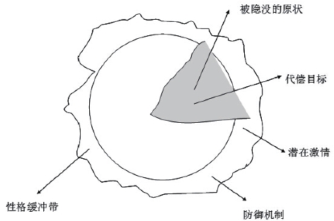 而在这个圆的外圈,为了更好地保护自己的感受,我们又生成了自己的防御机制,当防御机制出现以后,我们跟外在的生活又重新达到一个暂时的平衡。之所以说是暂时的平衡,是因为防御机制的产生,只是为了修补原先的错误——我们误以为“代偿目标”就是我们真正要找到的东西。