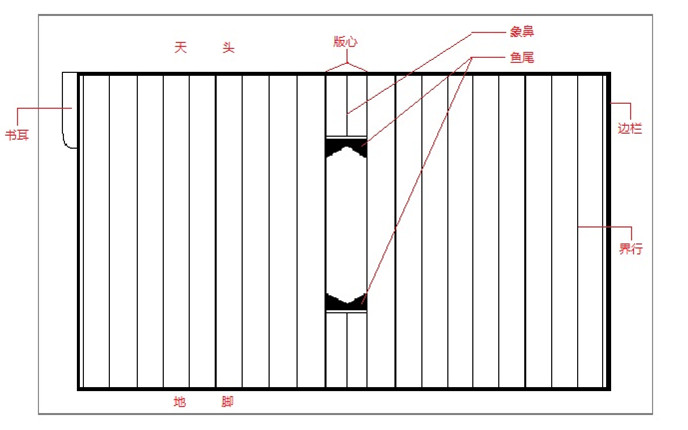 (5)象鼻:从鱼尾到边栏这一段版心中间的直线叫象鼻。无线的称白口,细黑线称小黑口或细黑口,粗黑线称大黑口或阔黑口。靠近上栏的叫上黑口,靠近下栏的叫下黑口,上下都有黑线的称上下黑口。