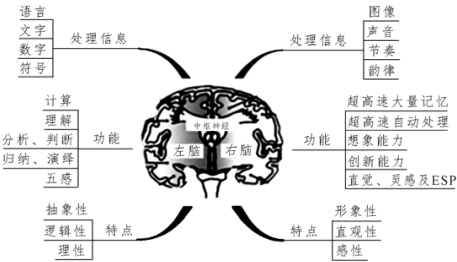 斯佩里发现:大脑左半球偏重于语言、概念、数字、分析、逻辑推理等功能;大脑右半球偏重音乐、绘画、空间几何、想象和综合等功能;正常人的心理活动是左右脑“分工合作”的结果。