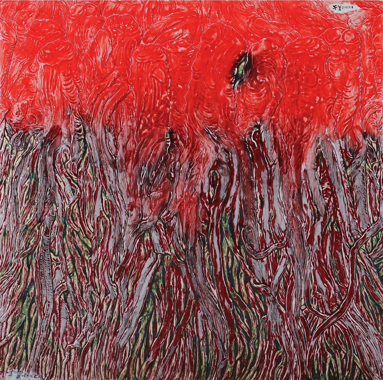 我在创作中,有一个思路。我觉得,这符合中医的万物一体的哲学思想。我们的精神、我们的肉身、我们的生活、我们的政治、我们的世界是一体的。我的创作名字很简单,就两个字—“当归”。我用景德镇独有的一种陶瓷材料来表现。“当归”有个什么概念呢?对的,就是补血。我觉得我们需要补血,中华民族也需要补血。怎么补呢?我们国家现在还没有完全统一,台湾还没有回归。我用的材料是釉里红,这个颜色原来是红的,但堆积多了就泛绿。所以,我这个理念有错综複杂的关係,这种哲学理念就是我的当归的作品理念。我也不知道这样想对不对,希望老师指出问题并给予批评。