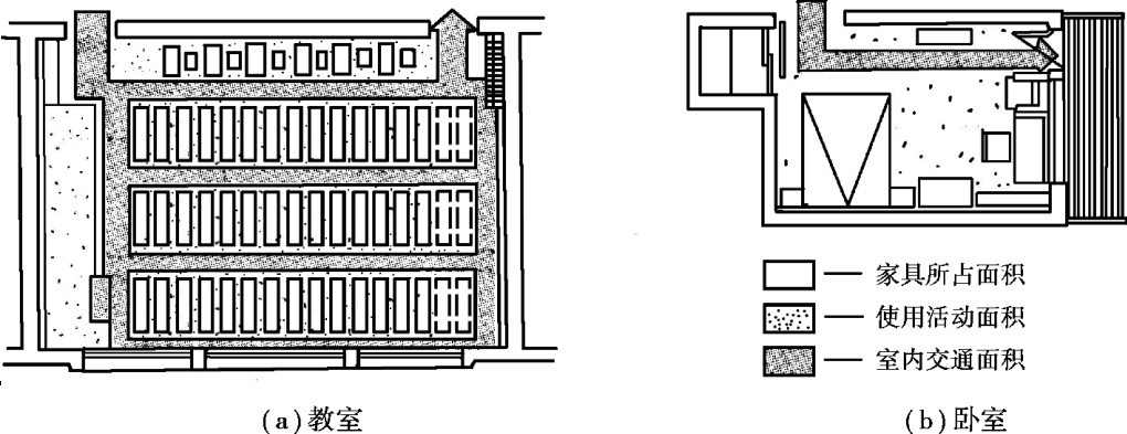 图2.2为教室和住宅卧室中室内使用面积分析示意图。