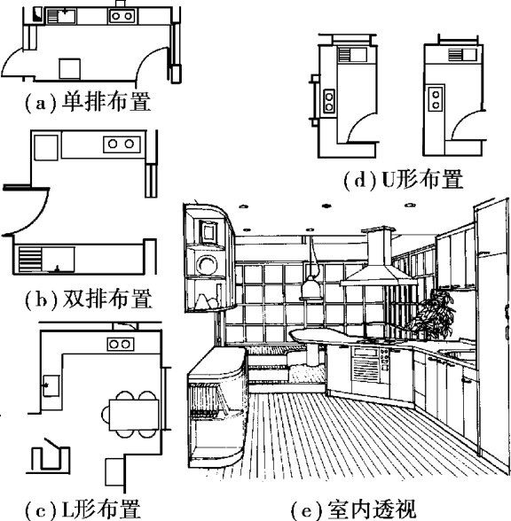 厨房的布置形式有单排、双排、L形、U形等几种,图2.21为厨房布置的几种形式。