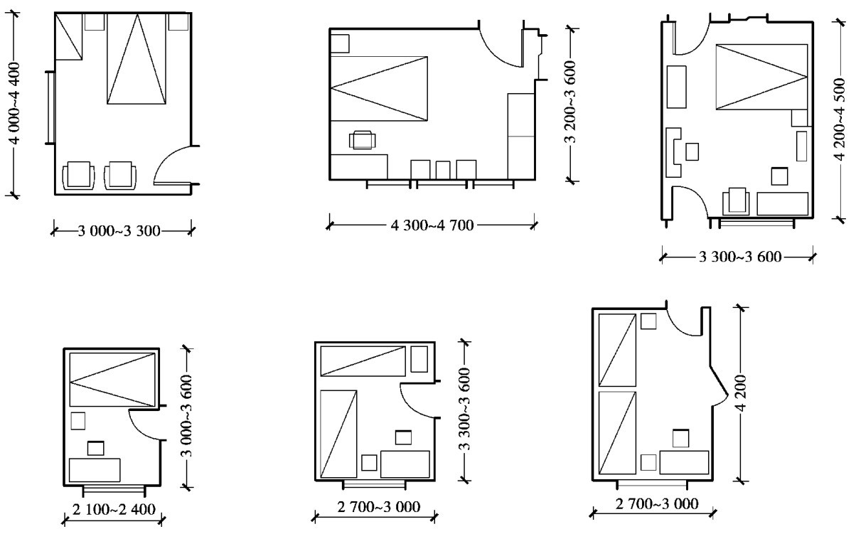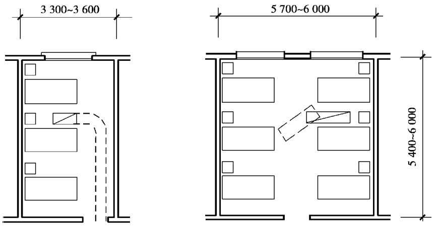 如卧室的平面尺寸应考虑床的大小、家具的相互关系、床位布置的灵活性。 主要卧室要求床两个方向都可布置,因此开间尺寸应保证床横放后剩余的墙面还能开一扇门,常取3.30m;深度方向应考虑横竖两个床中间再加一个床头柜或衣柜,常取3.90~4.50m。 小卧室考虑床竖放以后能开一扇门或放床头柜,开间尺寸常取2.70~3.00m(图2.6)。 医院病房主要是满足病床的布置及医护活动的要求,3~4人的病房开间尺寸常取3.30~3.60m,6~8人的病房开间尺寸常取5.70~6.00m(图2.7)。