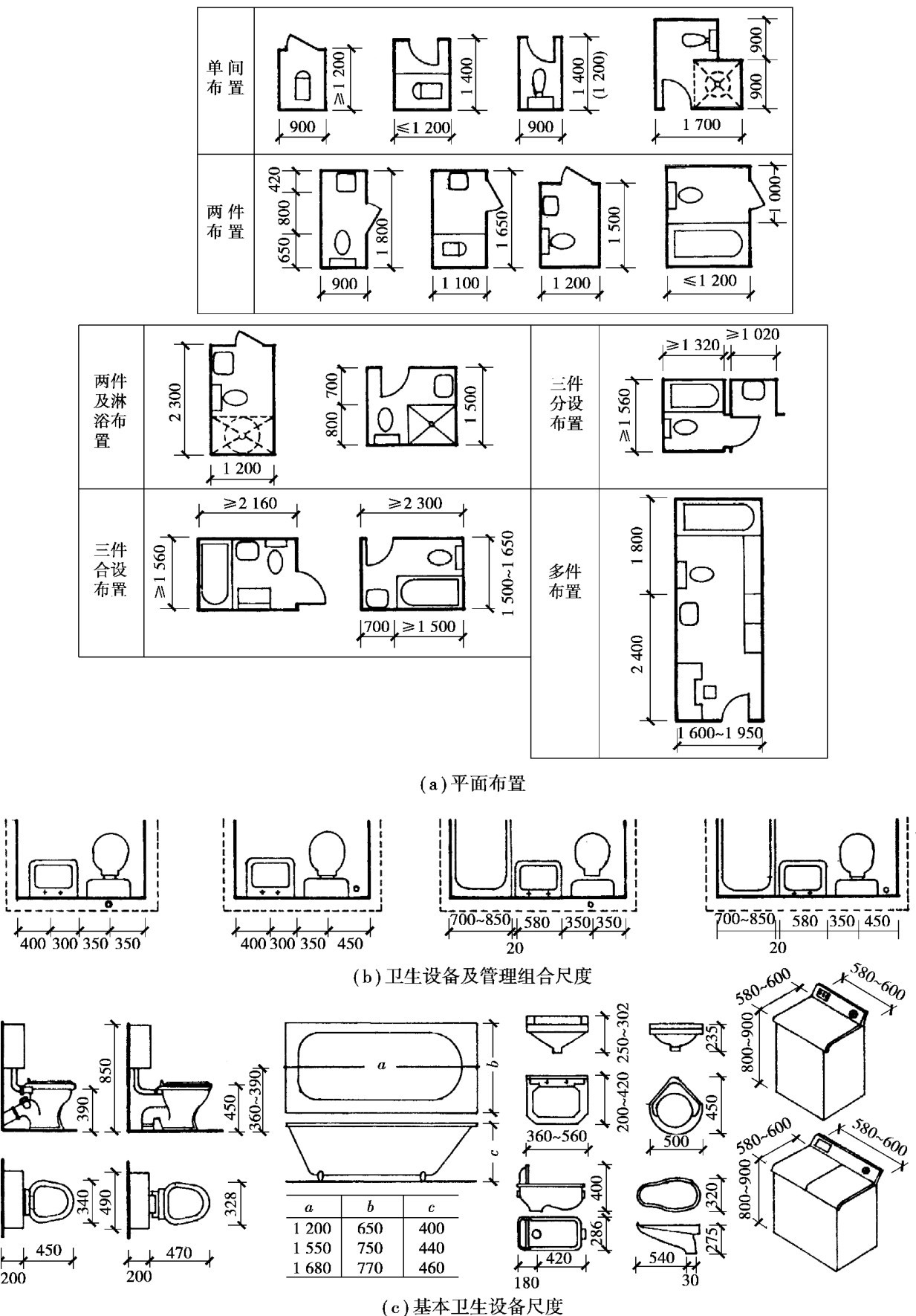 图2.19 洗脸盆、浴盆设备及组合尺寸