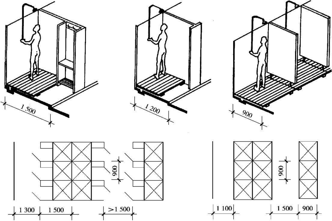 浴室和盥洗室的主要设备有洗脸盆、污水池、淋浴器、浴盆等。 除此之外,公共浴室还有更衣室,其中主要设备有挂衣钩、衣柜、更衣凳等。 设计时可根据使用人数确定卫生器具的数量(见表2.4),同时结合设备尺寸及人体活动所需的空间尺寸进行房间布置。 图2.19、图2.20分别表示浴室设备及其组合尺寸。