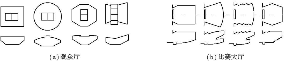 图2.4 影剧院观众厅和体育馆比赛大厅的平面形状及剖面示意