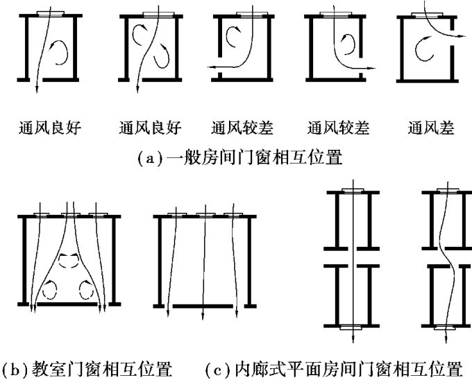 房间的自然通风由门窗来组织,门窗在房间中的位置决定了气流的走向,影响到室内通风效果。 因此,门窗位置应尽量使气流通过活动区,加大通风范围,并应尽量使室内形成穿堂风。图2.13为门窗位置对气流的影响。