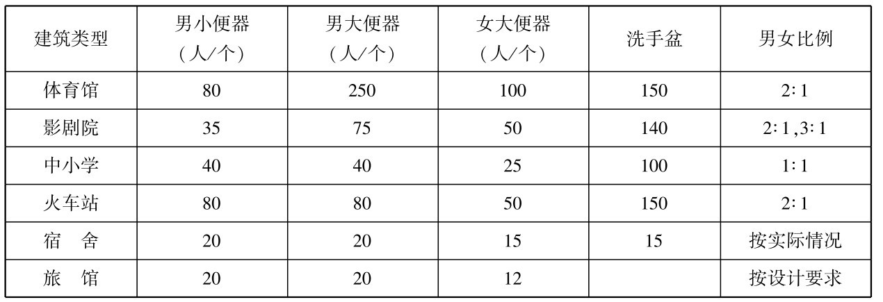 卫生设备的数量及小便槽的长度主要取决于使用人数、使用对象、使用特点。 经过实际调查和经验总结,一般民用建筑每一个卫生器具可供使用的人数可参考表2.3。