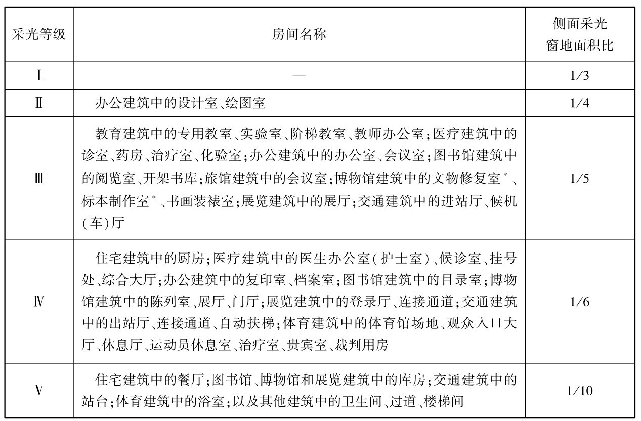注:∗表示采光不足部分应补充人工照明。