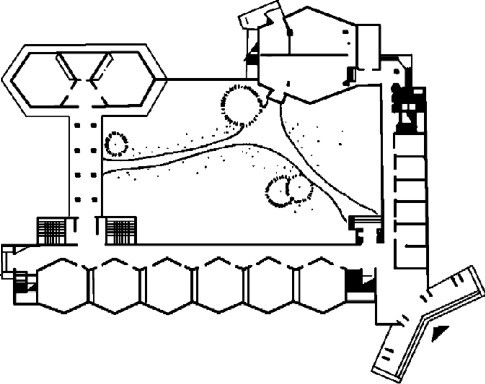 房间形状的确定,不仅仅取决于功能、结构和施工条件,也要考虑房间的空间艺术效果。 在空间组合设计中,常常将圆形、多边形及不规则形状的房间与矩形房间组合在一起,形成强烈的对比,丰富建筑造型。 如图2.5所示的某小学平面图,教室、音乐教室、阅览室等采用六角形平面,使整个建筑显得生动活泼,富有朝气。