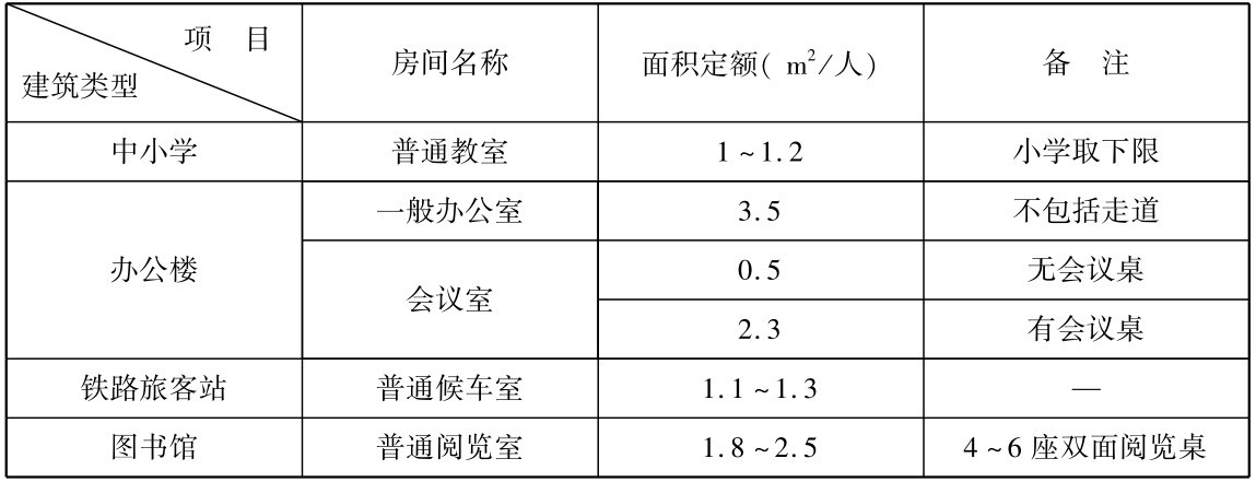 在实际工作中,房间面积的确定主要是依据我国有关部门及各地区制订的面积定额指标。根据房间的容纳人数及面积定额就可以得出房间的总面积。 应当指出:每人所需的面积除面积定额指标外,还需要通过调查研究并结合建筑物的标准综合考虑。 表2.1是部分民用建筑房间面积定额参考指标。