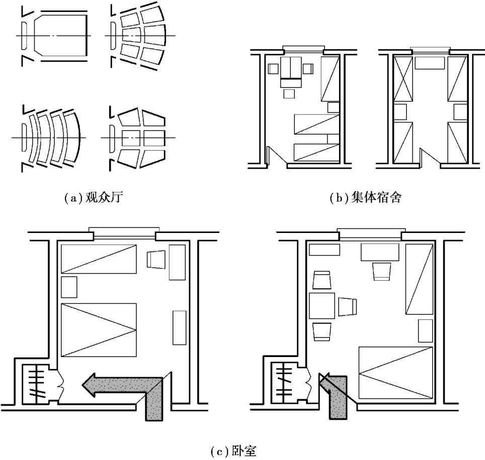 ①门窗位置应尽量使墙面完整,便于家具设备布置和合理组织人流通行。 图2.11分别表示观众厅、集体宿舍和卧室门的位置。
