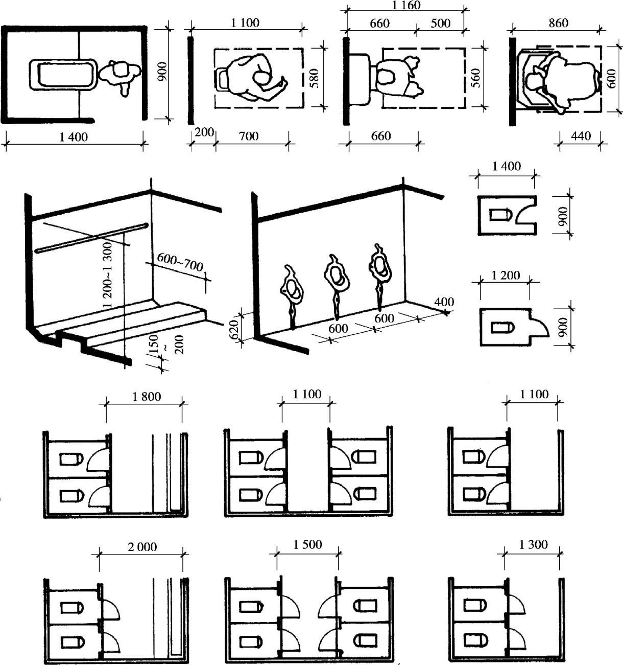 图2.15 厕所设备及组合尺寸