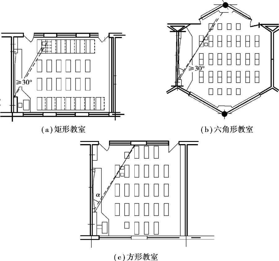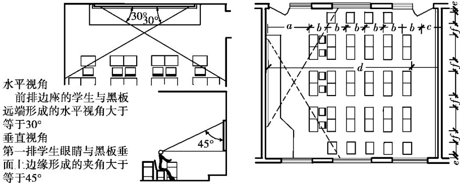 从视听的功能考虑,教室的平面尺寸应满足以下的要求(图2.8):