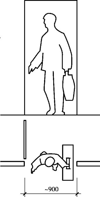 房间中门的最小宽度,是由通过人流多少及需要搬进房间的家具设备的大小决定的。 一般单股人流通行的最小宽度取550~600mm,一个人侧身通行需要300mm宽。 门的最小宽度一般为700mm,常用于住宅中的厕所、浴室。 住宅中卧室门的宽度常取900mm,这样的宽度可使一个携带物品的人方便地通过,也能搬进床、柜等尺寸较大的家具(图2.10)。 厨房、阳台的门宽可取800mm,这些较小的门窗开启时可以少占室内的使用面积,对于住宅这类平面要求紧凑的建筑,显得尤其重要。 住宅入户门考虑家具尺寸增大的趋势,常取1000mm。 普通教室、办公室等的门应考虑一人正常通行,另一人侧身通行,常采用1000mm。