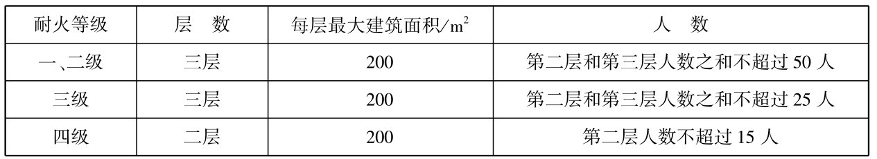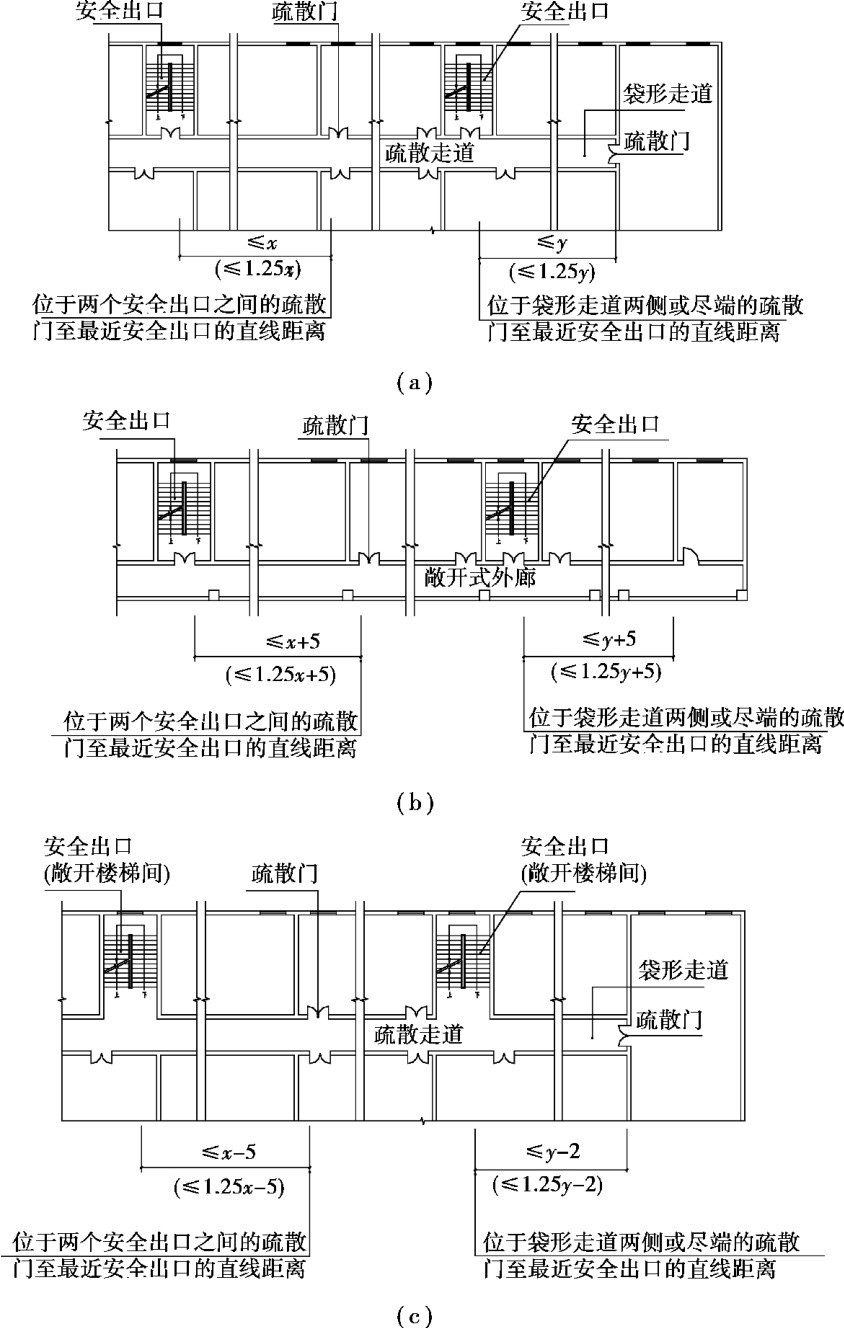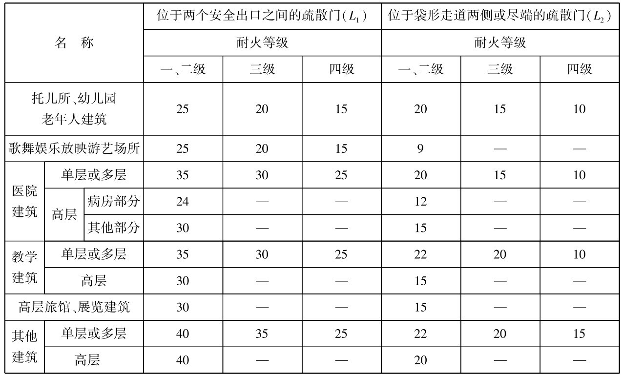 注:①建筑内开向敞开式外廊的房间疏散门至最近安全出口的直线距离可按本表的规定增加5m(图2.22b)。