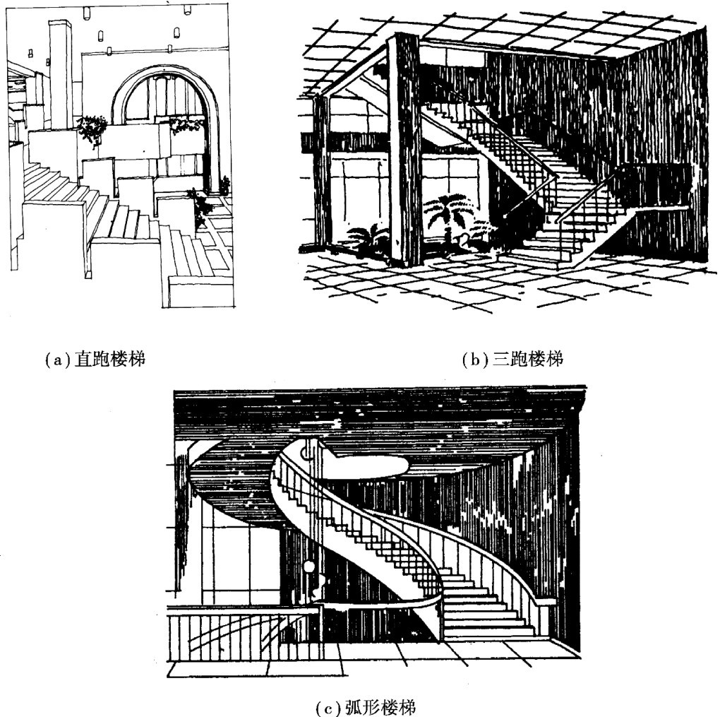 楼梯的形式主要有直跑梯、双跑梯、三跑梯等。 直跑梯方向单一,不转向,构造简单,常给人以严肃向上的感觉,除常用于层高较小的建筑外,大型公共建筑为解决人流疏散问题和加强大厅的气氛也常采用这种形式;双跑梯因面积紧凑,使用方便而成为民用建筑中最为常用的一种形式,通常布置在单独的楼梯间中;三跑梯梯井较大,面积浪费较多,当建筑物的层高较大,或利用楼梯间顶部天窗采光时,采用三跑梯可取得较好的效果。
