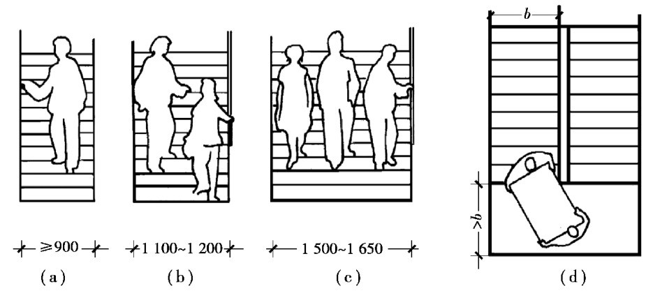 楼梯的宽度和数量主要根据使用要求和防火规范来确定。 和走道一样,楼梯梯段的宽度应首先满足人流通行需要,当考虑两人相对通过时,应不小于1100~1200mm,但住宅内部楼梯考虑到两人上下时能有侧身避让的余地,其最小宽度可减小到750~900mm(图2.25)。 所有楼梯梯段宽度的总和应按照《建筑设计防火规范》(GB50016—2014)的最小宽度进行校核,见表2.5、表2.7。