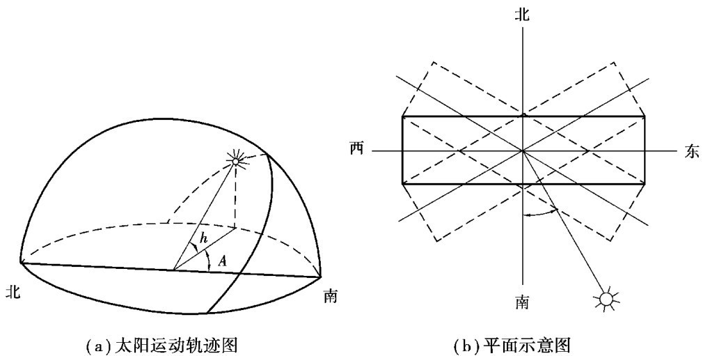 在不同季节与时间里,太阳的位置、高度都在发生变化,阳光射进房间里的深度和日照时间也不相同。 太阳在天空的位置可以用高度角和方位角来确定(图2.48)。 太阳高度角是指太阳射到地球表面的光线与地平面的夹角h,方位角是太阳射到地球表面的光线与南北轴线所成的夹角A。 方位角在南北轴线之西标注正值,在南北轴线之东标注负值。