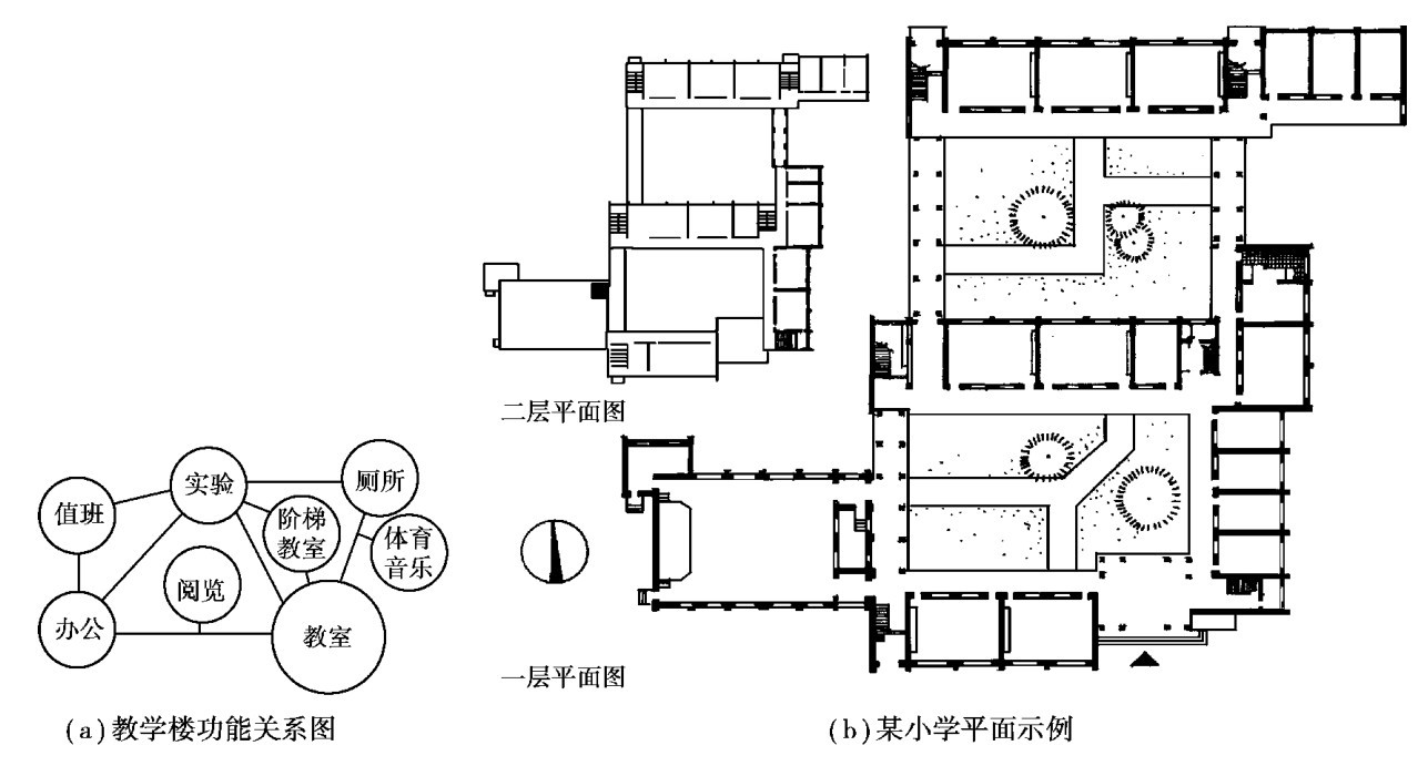 从图2.47(b)小学功能关系分析图中可以知道小学需要安静的学习环境,但小学本身也是一个噪声源,应尽量避免与周围环境相互之间的干扰。 为此,平面组合应注意: