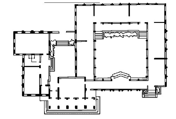 套间式组合的特点是用穿套的方式按一定的序列组织空间。房间与房间之间相互穿套,不再通过走道联系。 这种形式通常适用于房间的使用顺序和连续性较强,使用房间不需要单独分隔的情况,如展览馆、火车站、浴室等建筑类型。 套间式组合按其空间序列的不同又可分为串联式和放射式两种。 串联式是按一定的顺序关系将房间连接起来,放射式则将各房间围绕交通枢纽呈放射状布置(图2.43、图2.44)。