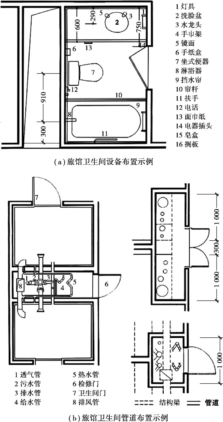 图2.41中旅馆卫生间成组布置,利用两个卫生间中间的竖井作为管道垂直方向布置的空间,管道井上下叠合,管线布置集中。