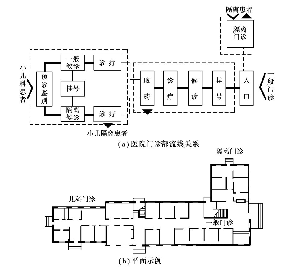 图2.35 医院门诊部流线关系及平面示例