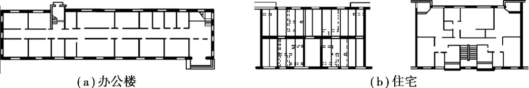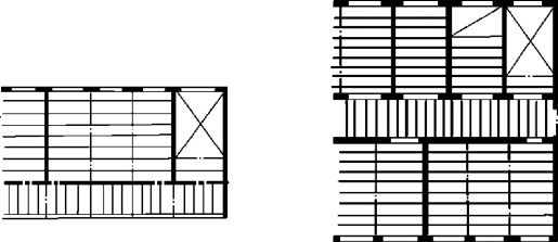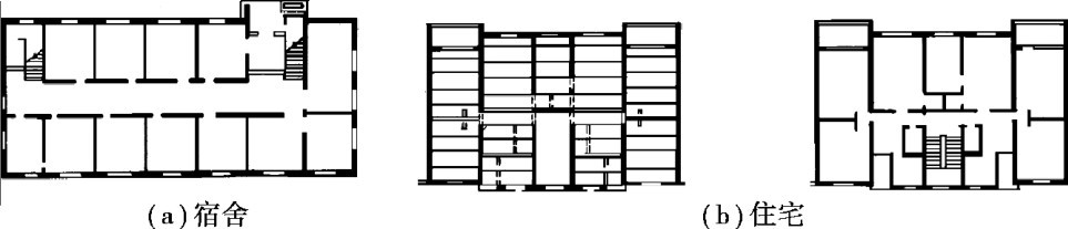 混合结构根据结构布置方式可分为横墙承重、纵墙承重、纵横墙承重三种方式。 当房间开间尺寸重复较多,且符合钢筋混凝土板经济跨度时,常采用横墙承重;当房间开间尺寸多样但进深尺寸较统一,且符合钢筋混凝土板的经济跨度时,可采用纵墙承重;当一部分房间的开间尺寸和另一部分房间的进深尺寸符合钢筋混凝土板的经济跨度时,可采用纵横墙承重。 图2.36、图2.37、图2.38为采用墙体承重的结构平面布置示意图。