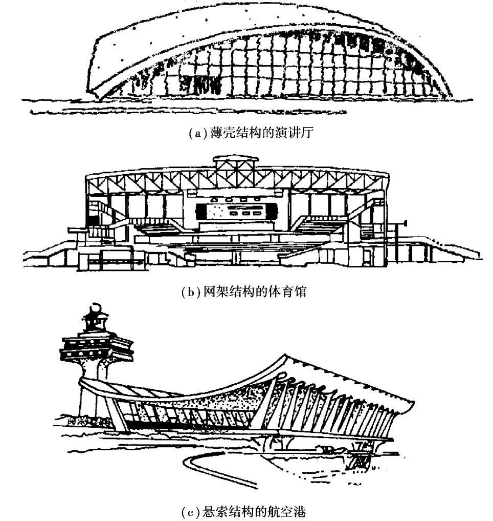 随着建筑技术、建筑材料和结构理论的进步,新型高效的建筑结构也有了飞速的发展,出现了各种大跨度的新型空间结构,如薄壳、悬索、网架等。 这类结构用材经济,受力合理,并为解决大跨度的公共建筑提供了有利条件,适用于体育馆、影剧院等有大空间要求的建筑。 图2.40(a)、(b)、(c)分别为薄壳结构、网架结构、悬索结构的大跨度建筑。