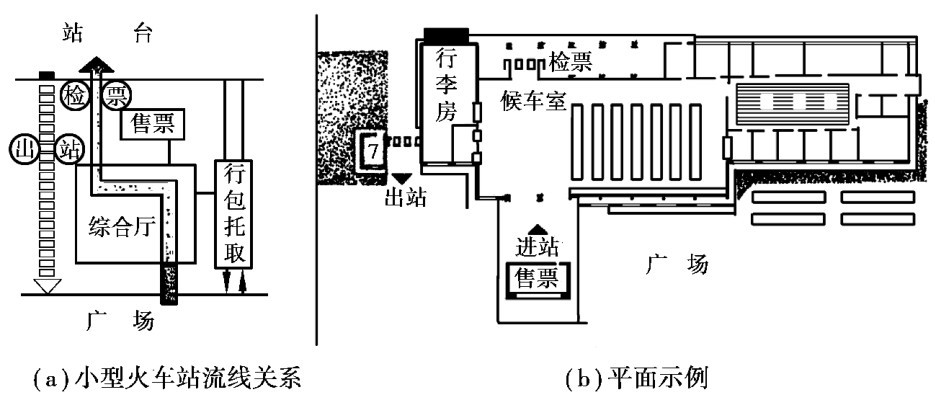 图2.34 小型火车站流线关系及平面示例
