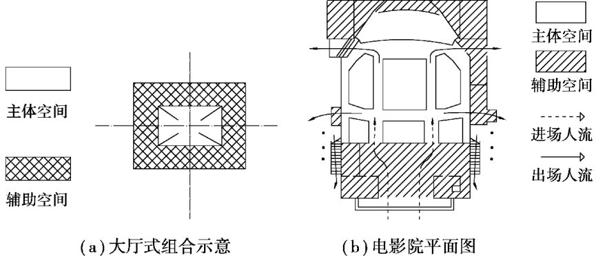 大厅式组合以公共活动的大空间为主,辅助房间围绕大空间布置。 这种组合的特点是大空间的使用人数多、面积大、层高大,其主体地位十分突出,如影剧院、会场、体育馆等(图2.45)。
