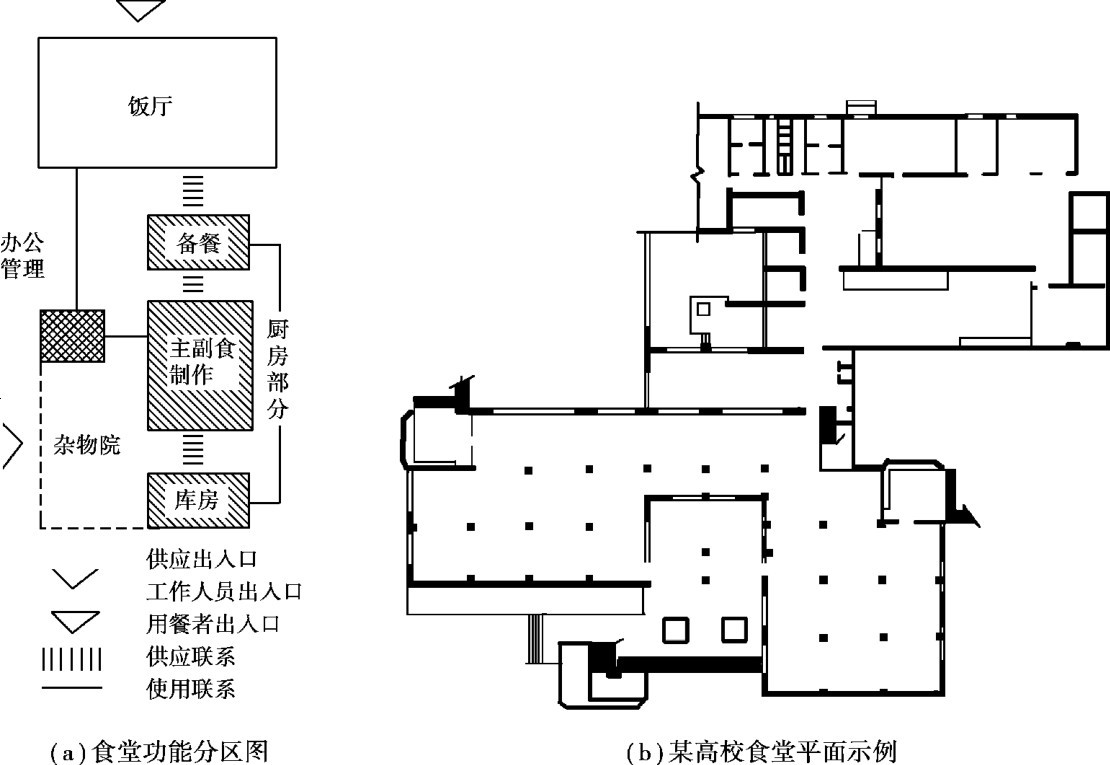 各类建筑的组成房间中,有的对外联系密切,直接为外来人员服务,有的对内关系密切,供内部使用。 如食堂的餐厅对外,而厨房和各种库房则对内;又如影剧院的观众厅、售票房、休息厅、公共厕所是对外,而办公室、管理用房是对内的。 平面组合时应妥善处理功能分区的内外关系。 图2.32表示食堂房间的内外关系。