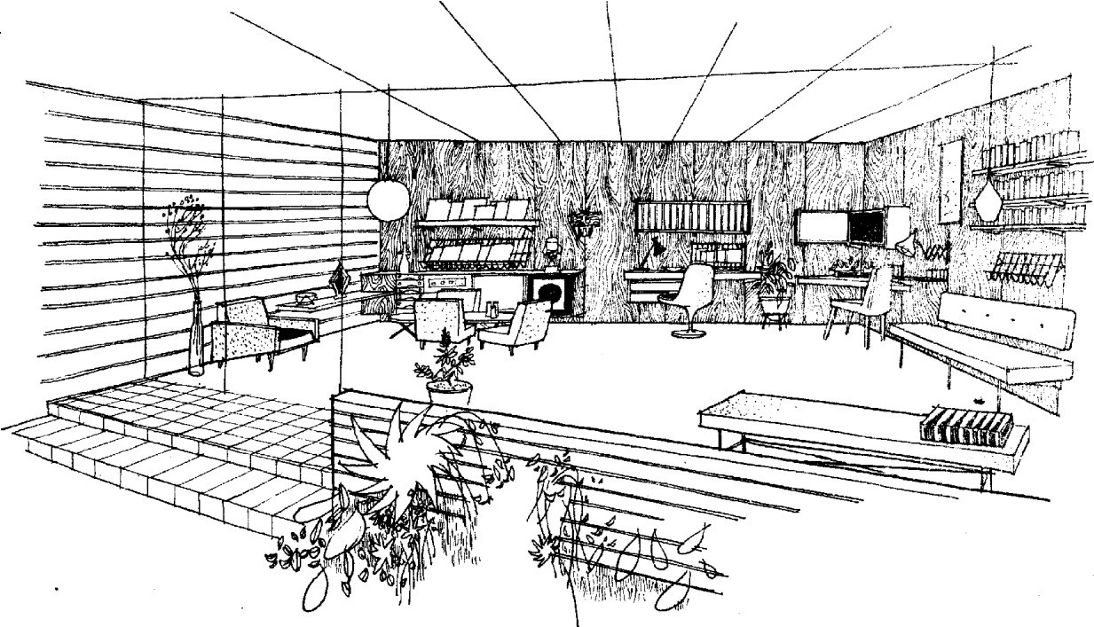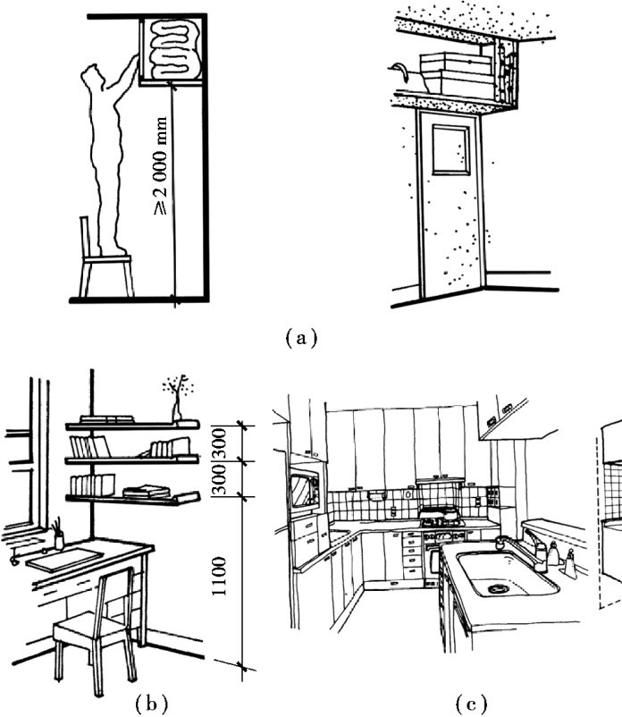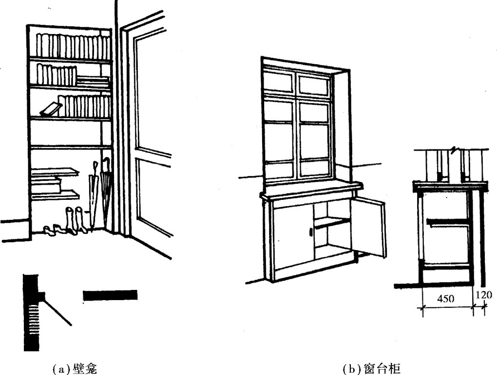 住宅中常利用房间上部空间设置搁板、吊柜作为储藏之用(图3.22)。 在一些房间中还利用墙体空间设置壁龛、窗台柜(图3.23),利用角柱布置书架及工作台。