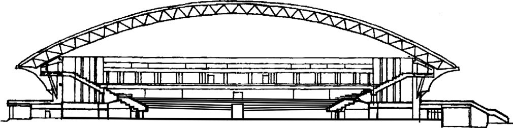 影剧院、体育馆等建筑虽然有多个空间,但其中有一个大空间(观众厅或比赛大厅)是主体,其面积和高度都比其他房间大得多。 空间组合常以大空间为中心,在其周围布置小空间,或将小空间布置在大厅看台下面,如图3.17所示的体育馆,以比赛大厅为中心将运动员休息室、更衣室、贵宾室以及设备用房等布置在看台下,并利用四周的休息廊将辅助空间和比赛大厅、门厅联系起来。