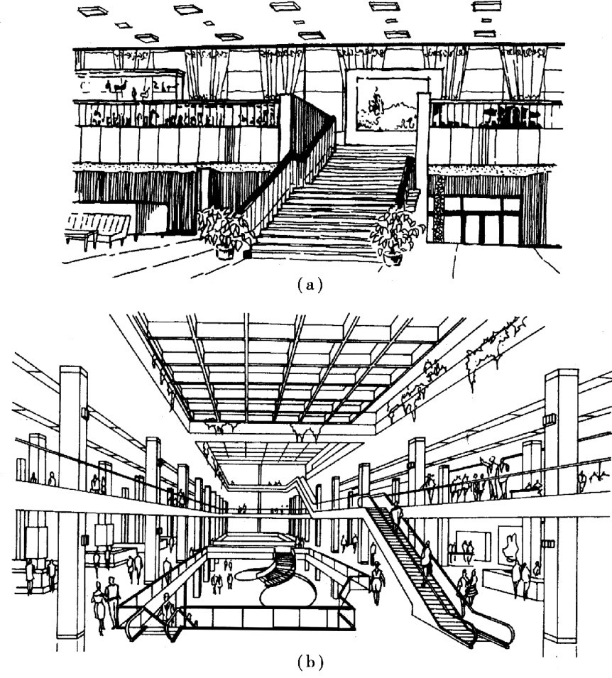 在大型商场、体育馆、影剧院、候机楼等公共建筑中,常常有平面尺寸和空间高度都很大的空间,由于功能要求,其主体空间与辅助空间的面积和层高通常不一致,为了充分利用空间及丰富室内空间的效果,常采取在大空间周围布置夹层的方式(图3.21)。