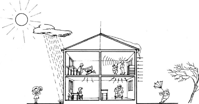 一座建筑物建成并投入使用后,要经受着自然界各种因素的检验。 为了提高建筑物对外界各种影响的抵御能力,延长建筑物的使用寿命,以便更好地满足使用功能的要求,在进行建筑构造设计时,必须充分考虑到各种因素对它的影响,以便根据影响程度,来提供合理的构造方案。 影响的因素很多,归纳起来大致可分为以下几方面,如图5.2所示。