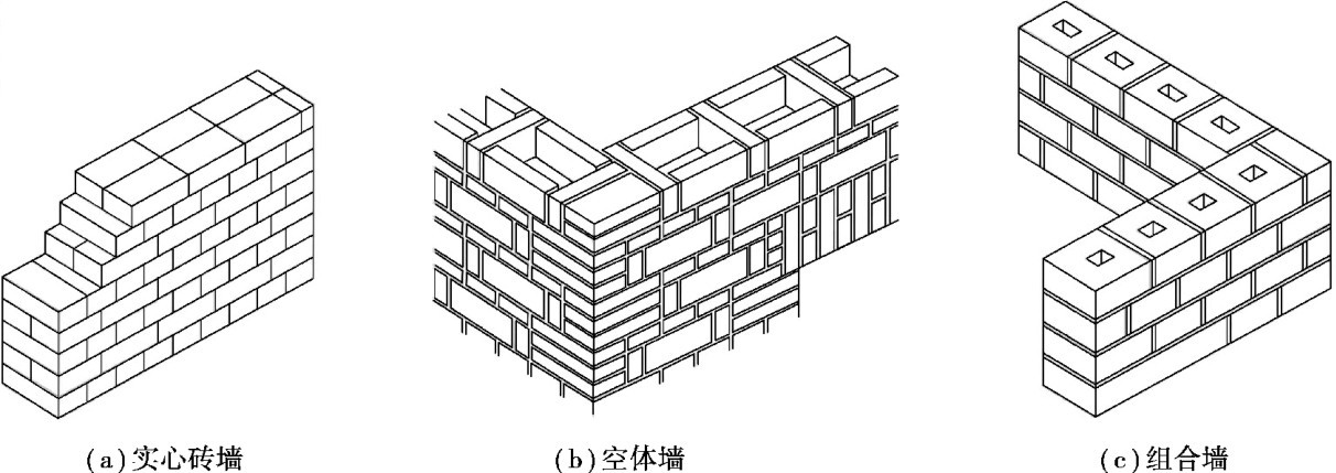 按构造方式不同可分为实体墙、空体墙和组合墙三种。 实体墙由单一材料组成,如烧结普通砖及其他实体砌块砌成的墙;空体墙也是由单一材料组成,如空斗墙(内部为空腔)、空心砌块墙、空心板墙等;组合墙是由两种以上材料组合而成的墙,其主体结构一般为烧结普通砖或钢筋混凝土,内外侧复合轻质保温材料,常用的有充气石膏板、水泥聚苯板、水泥珍珠岩、石膏聚苯板、纸面石膏岩棉板、石膏玻璃丝复合板以及目前为满足建筑节能要求的聚苯板和挤塑苯板等,这些组合墙体质量轻、导热系数小,按《民用建筑节能设计标准》(JGJ26—2010)要求,可用于有节能要求的建筑墙体当中。 如图7.2所示。