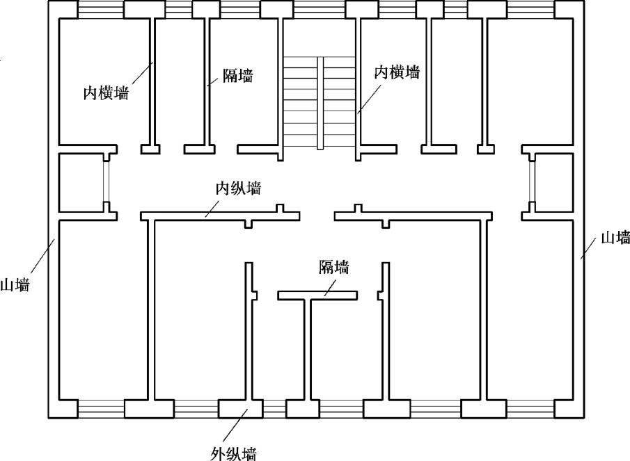 墙体在平面中所处位置不同分为外墙、内墙、纵墙和横墙。